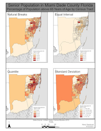 This week's Module (Module 4) dealt with statistics and how to represent statistics on a map in order for them to be accurate and easy to read and understand. The assignment involved producing two maps each map was broken down into 4 distinct maps with each represented a different type of statistical classification system. Natural breaks, equal interval, quantile and standard deviation classification systems were used for both maps. The difference in the maps was the normalization of data. The second layout normalized all classifications by the area (in square miles) of the census tract. After analyzing the results of both maps and each classification system it appears as if the quantile classification system best displays the data provided. In some cases variation within classes was very minimal or very hard to see. On my layout with normalized data I used an inset map to detail the northeastern portion of Miami Dade County. Even with the inset the data is difficult to see. The true issue is that the data does not work well with a standard deviation classification system.